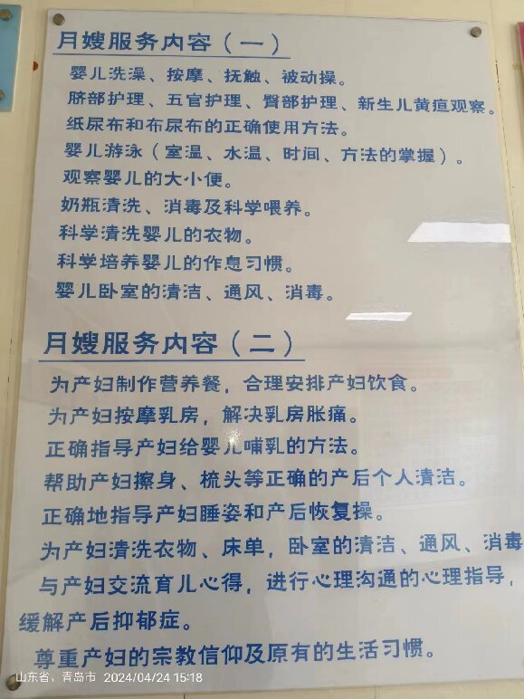 具体内容:1、日常清洁:协助宝妈漱口、洗脸、洗脚、擦汗、会 yin 清洁:对家中室温达到 26°C、有淋浴设施等条件的宝妈给予协助洗头、洗澡(应尊重客户意见)。2、为宝妈做营养配餐:三正三加(依宝妈口味并符合产后营养需要)。3、测体温(视情况而定)。4、乳房护理:产后乳汁未通畅时给予乳房清洁、按摩,协助母乳喂养,乳汁通畅后只进行喂养前乳房清洁,不再按摩;5、对产妇进行必要的心理健康、产后保健等指导; 6、及时更换清洗整理产妇的衣物、床单、被罩等用品。7、打扫产妇房间卫生。